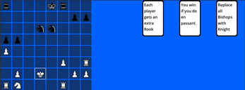 Calvinball is a game invented by calvin in the comic strip "calvin and hobbes" that uses various sporting equipment. Supposedly, the only permanent rule in calvinball is that it can never be played the same way twice, so new rules need to be made each time. I though of calvinball when I saw the theme of this jam and wanted to apply that template to chess. There are 27000 possible rulesets for calvinball chess, so yes, technically, it can be played the same way twice if you win the lottery.